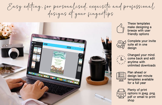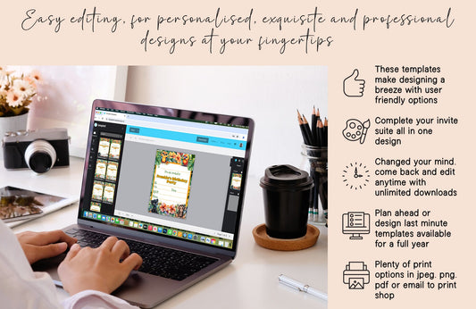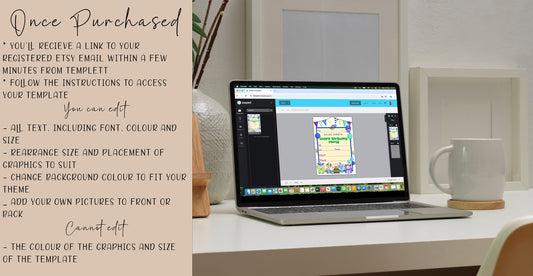 Dinosaur theme children's birthday party invite - Fully editable baby dino template, with colourful flowers and green leafs - 7x5
