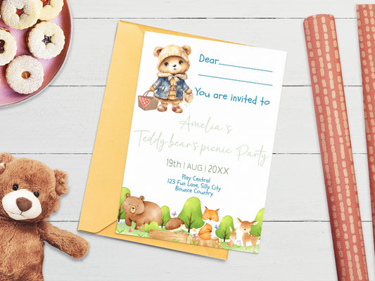 Girl's teddy bear picnic children's invitation - Fully editable kid's forest theme template - custom woodland birthday party invite 7x5