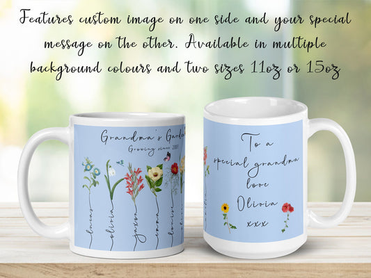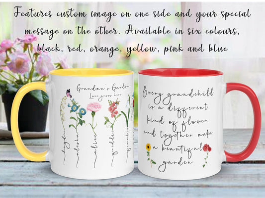 Nannas garden mug in white or with red, yellow, orange, blue, pink or black colour inside
