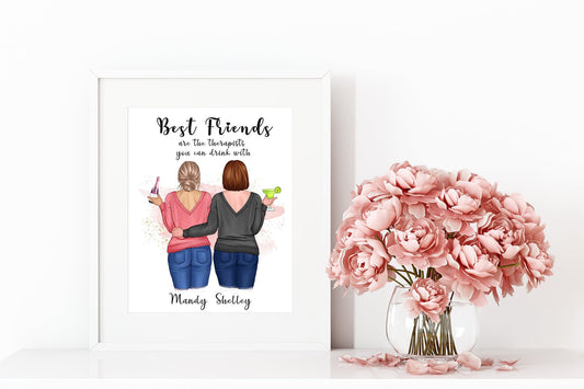 Custom besties portrait gift, with cocktails and wine | Print of best friends | A4 | A5 | Greeting card