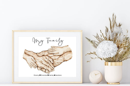 Watercolour grandparent and grandchild hands portrait | Black and white or full colour | Couple with up to 1-5 children | A3 | A4 | A5