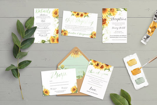Large Sunflower Wedding Invitation Bundle - 15 Editable Templates in Sunshine yellow flowers and hints of olive green - Complete wedding set