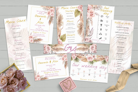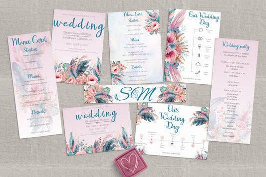 Boho Wedding Invitation Suite | Pink Rose & Feather Design | 15x editable designs RSVP, Menu, Program, Belly Band + More | Instant Download