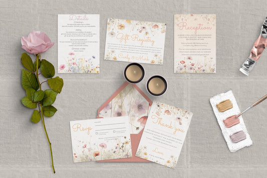Wild bloom flower large wedding template bundle - 15x Editable Templates with colourful pink and orange meadow flowers - Full wedding suite