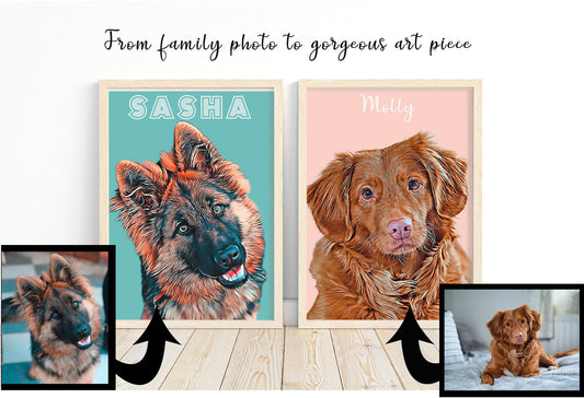 Custom Cartoon Style Pet Portrait - Vibrant, Digitally Created Artwork of Your Beloved Dog | 1-4 animals | A5 | A4 | 10x8 | A3