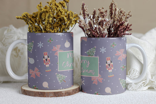 Personalised Purple Christmas Mug | Festive Hand-Drawn Design | Custom Name on 11oz Ceramic Mug | illustration of nutcracker, tree and holly