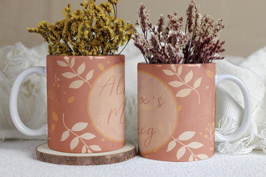 Personalised Leaf Mug | Hand-Drawn Leaf & Berry Pattern | Custom Name on 11oz Ceramic Mug | Orange and Cream background