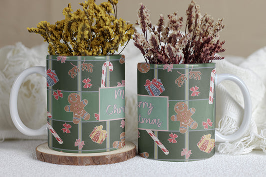 Personalised Plaid Christmas Mug | Festive Hand-Drawn Design | Custom Name on 11oz Ceramic Mug | illustrations of gingerbread & candy canes.