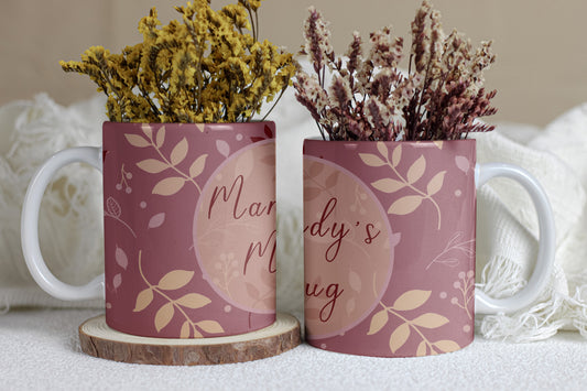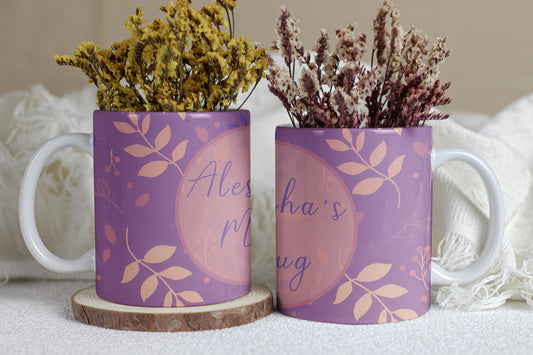 Personalised Leaf Mug | Hand-Drawn Leaf & Berry Pattern | Custom Name on 11oz Ceramic Mug | Purple and Pink background