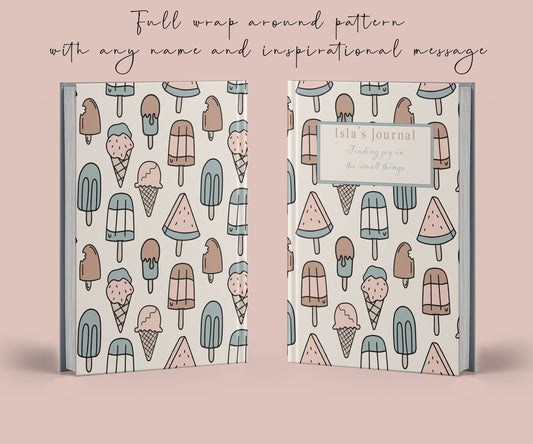 Custom name journal, with beach vibes summer style patterns in boho colours of cream, pink and blue hues