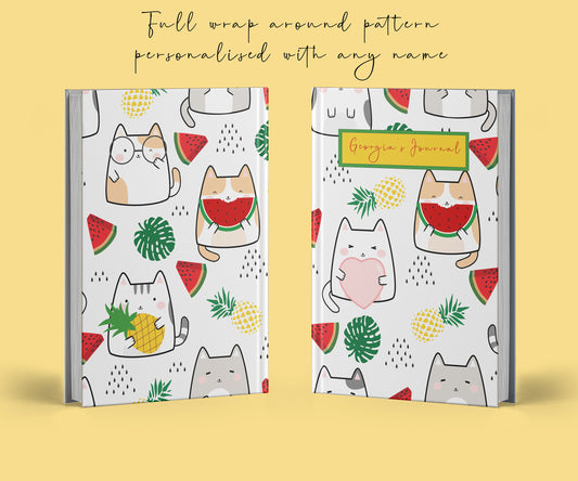 Cute Kawaii custom journal - bright, fun, colourful cartoon cat pattern wrapped around a glossy notebook | A4 | A5 | 5x7
