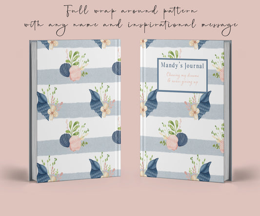 Personalised nautical journal - beautifully decorated in a coastal theme pattern in colours of blue, white, gold and pink | A4 | A5 | 5x7