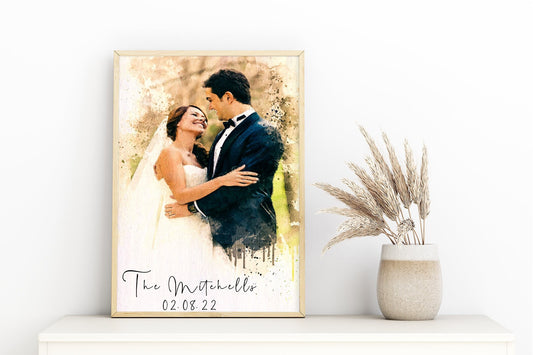 Watercolour wedding portrait from photo, digitally enhanced painting of bride and groom | A4 | A5 |