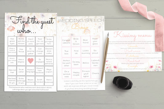 Wedding game pack template bundle with wild bloom flowers - 9x Editable Templates - I Spy, Shoe game, Bingo, Mad libs, Find the guest