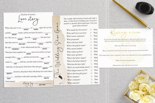 Wedding game pack template bundle in Golden Shimmer design - 9x Editable Templates - I Spy, Shoe game, Bingo, Mad libs, Find the guest...