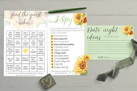 Wedding game pack template bundle in Bright Sunflower design - 9x Editable Templates - I Spy, Shoe game, Bingo, Mad libs, Find the guest...