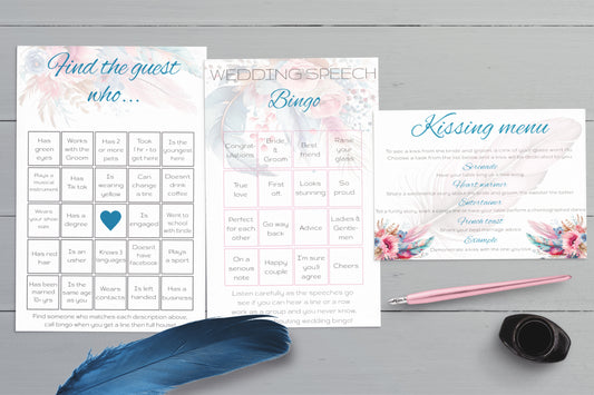 Wedding game pack template bundle with gorgeous Blue feathers - 9x Editable Templates - I Spy, Shoe game, Bingo, Mad libs, Find the guest...