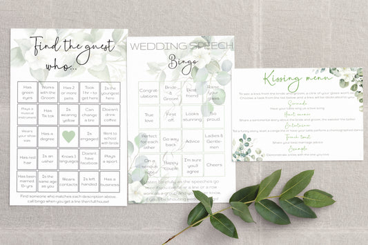 Wedding game pack template bundle with green eucalyptus leaves - 9x Editable Templates - I Spy, Shoe game, Bingo, Mad libs, Find the guest..