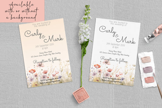 Colourful Wild Bloom Wedding Invitation - Editable Template. Beautiful wildflower designs in shades of yellow, orange and pink - 5x7