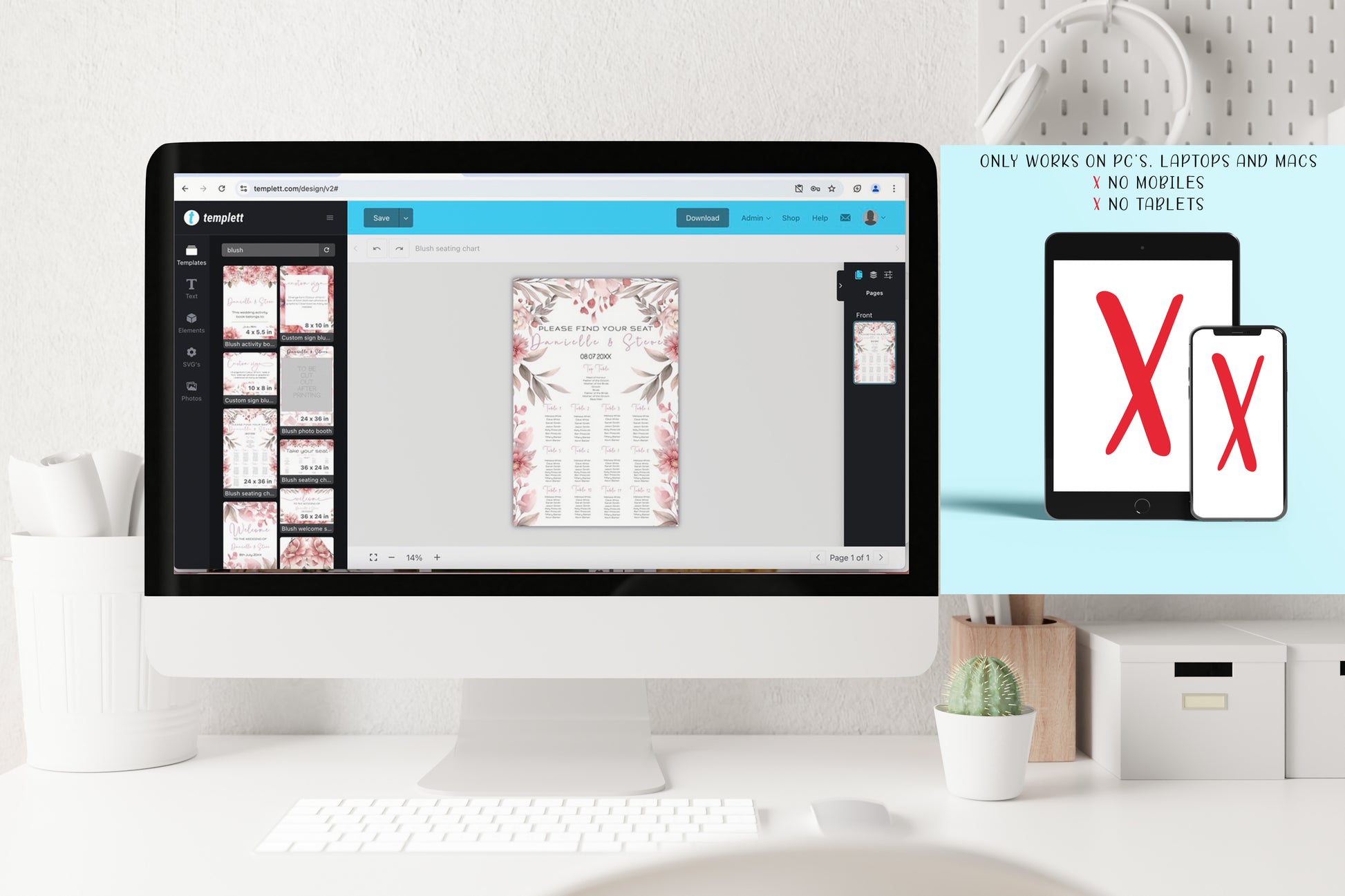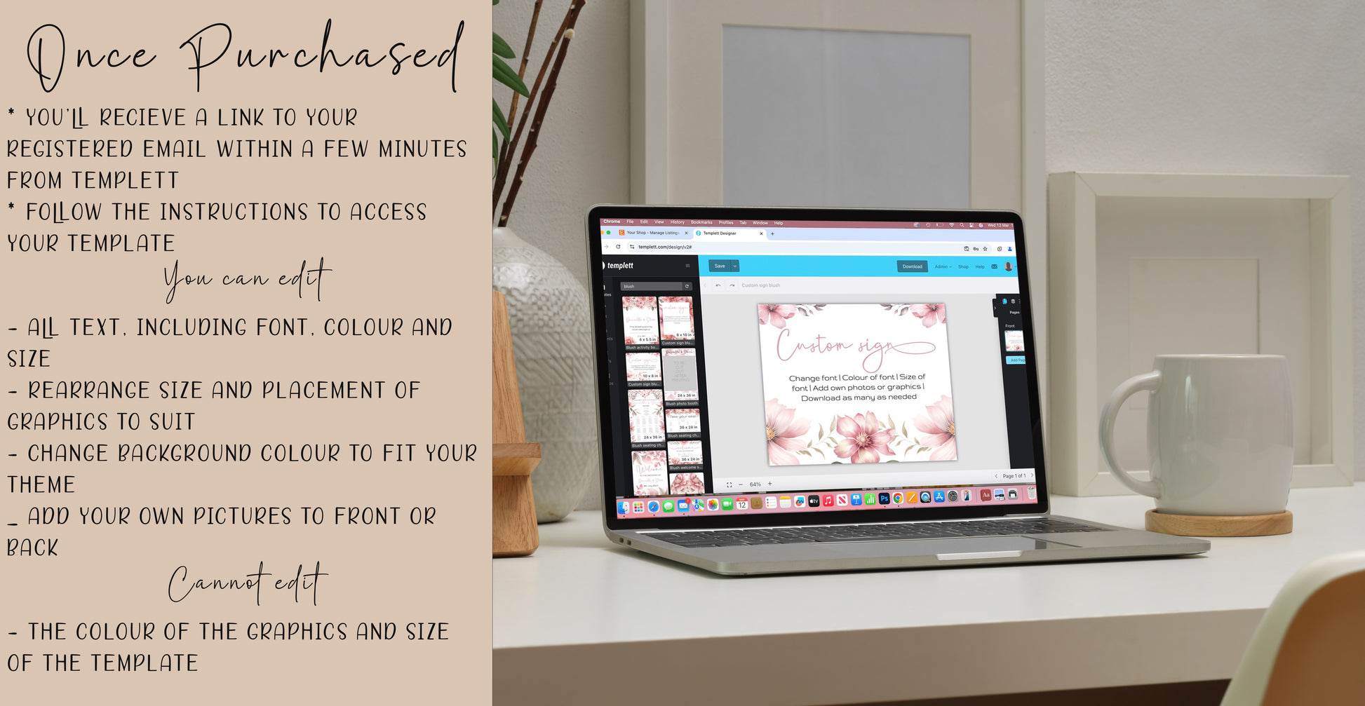 Templett is user-friendly popular editing software. No graphic design skills are required. Simply personalise the text, fonts, and colours to match your wedding theme and style. You can add your own photos front and back.
