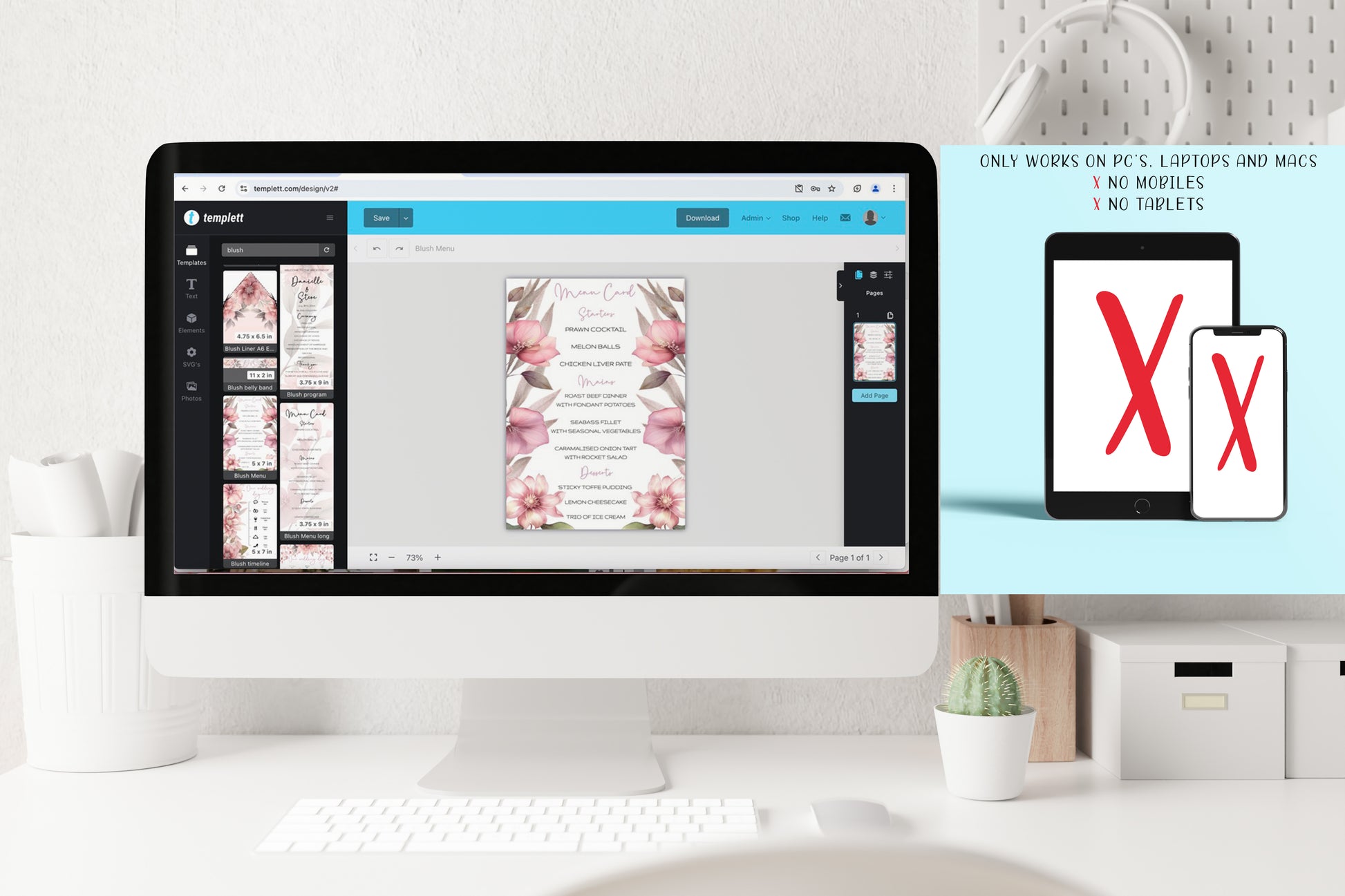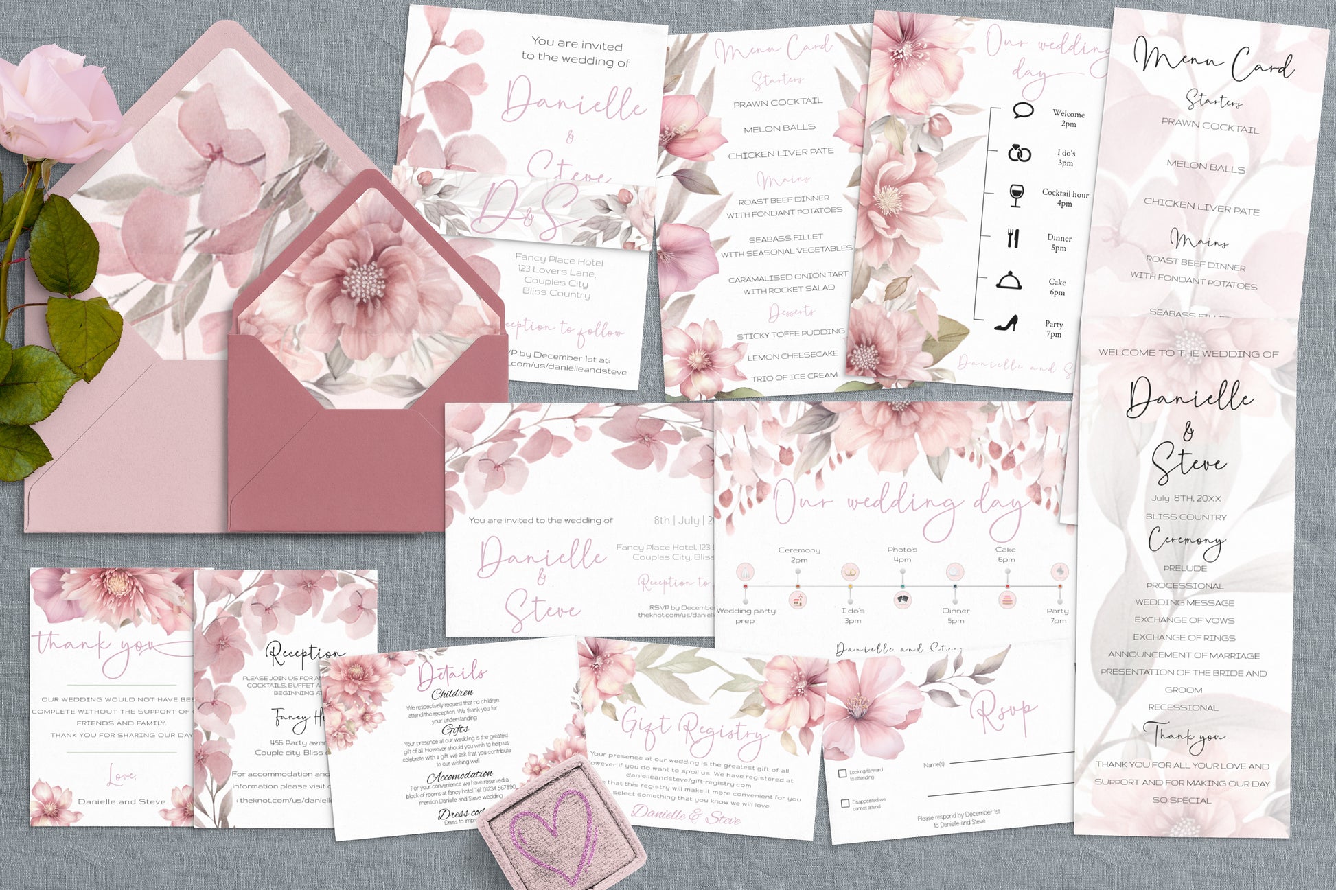 Blush pink Large Wedding Suite template bundle, the perfect choice for brides and engaged couples seeking stationary that embraces the subtle delicate beauty of feminine blush pink flowers. Our editable template empowers you to create personalised wedding invitation, RSVP and thank you cards, details and reception cards, menu and gift cards, program and timelines, liners and belly band all adorned with pretty pinks and the elegance of simplicity. Craft Your Dream Wedding suite with Natural Elegance!