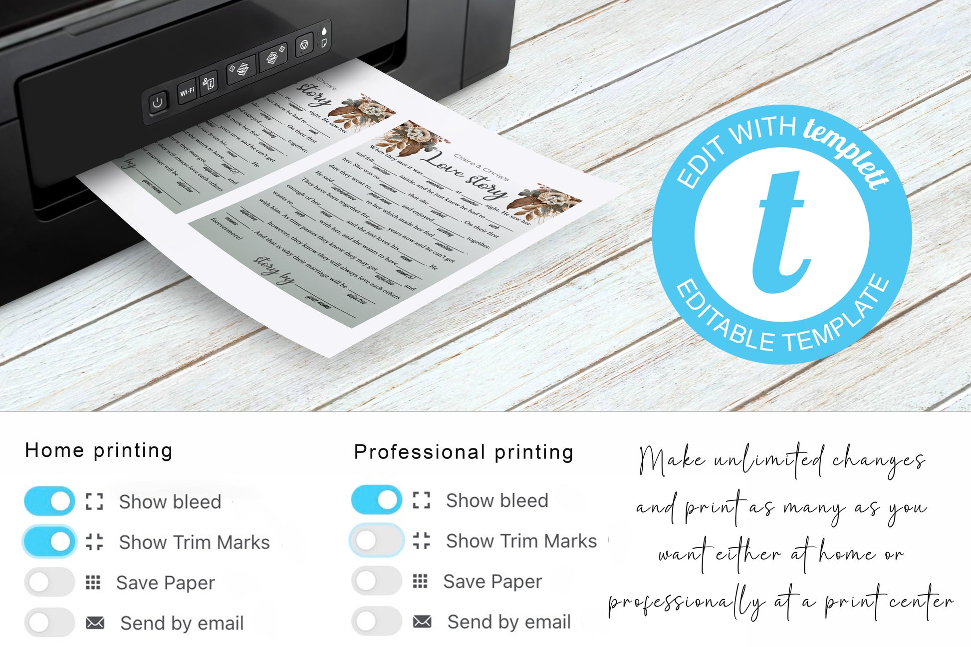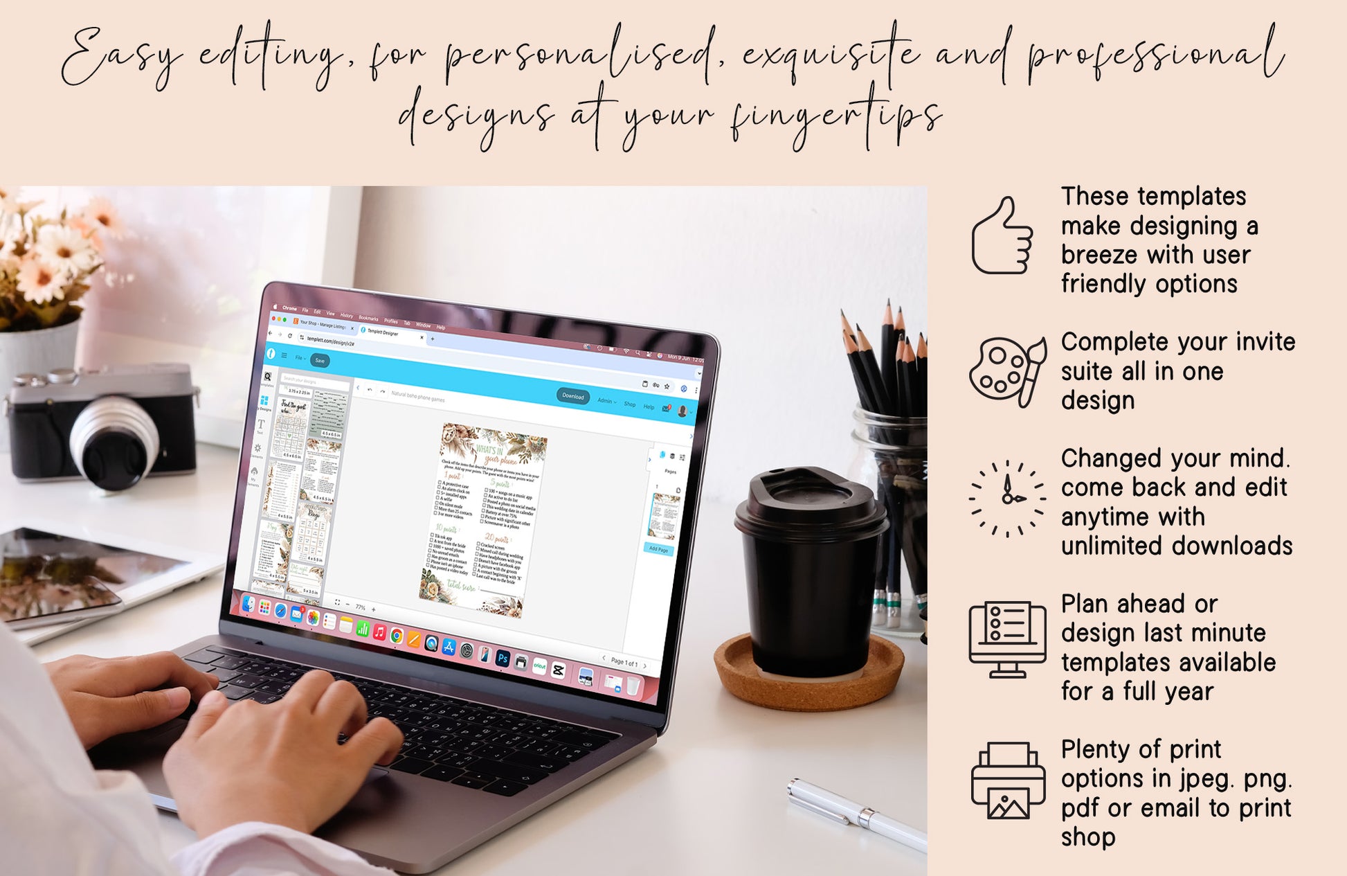 Templett is user-friendly popular editing software. No graphic design skills are required. Simply personalise the text, fonts, and colours to match your wedding theme and style. You can add your own photos front and back.