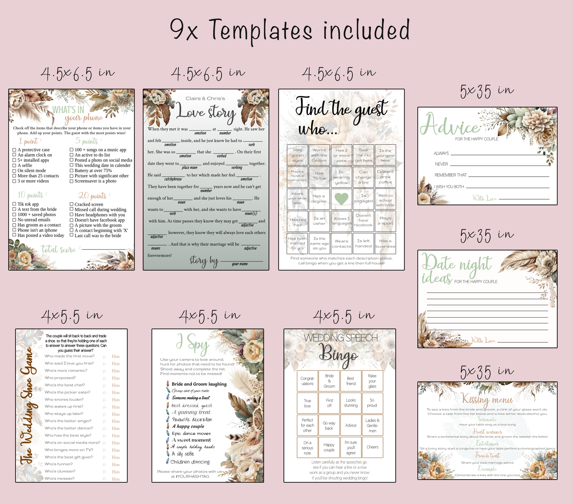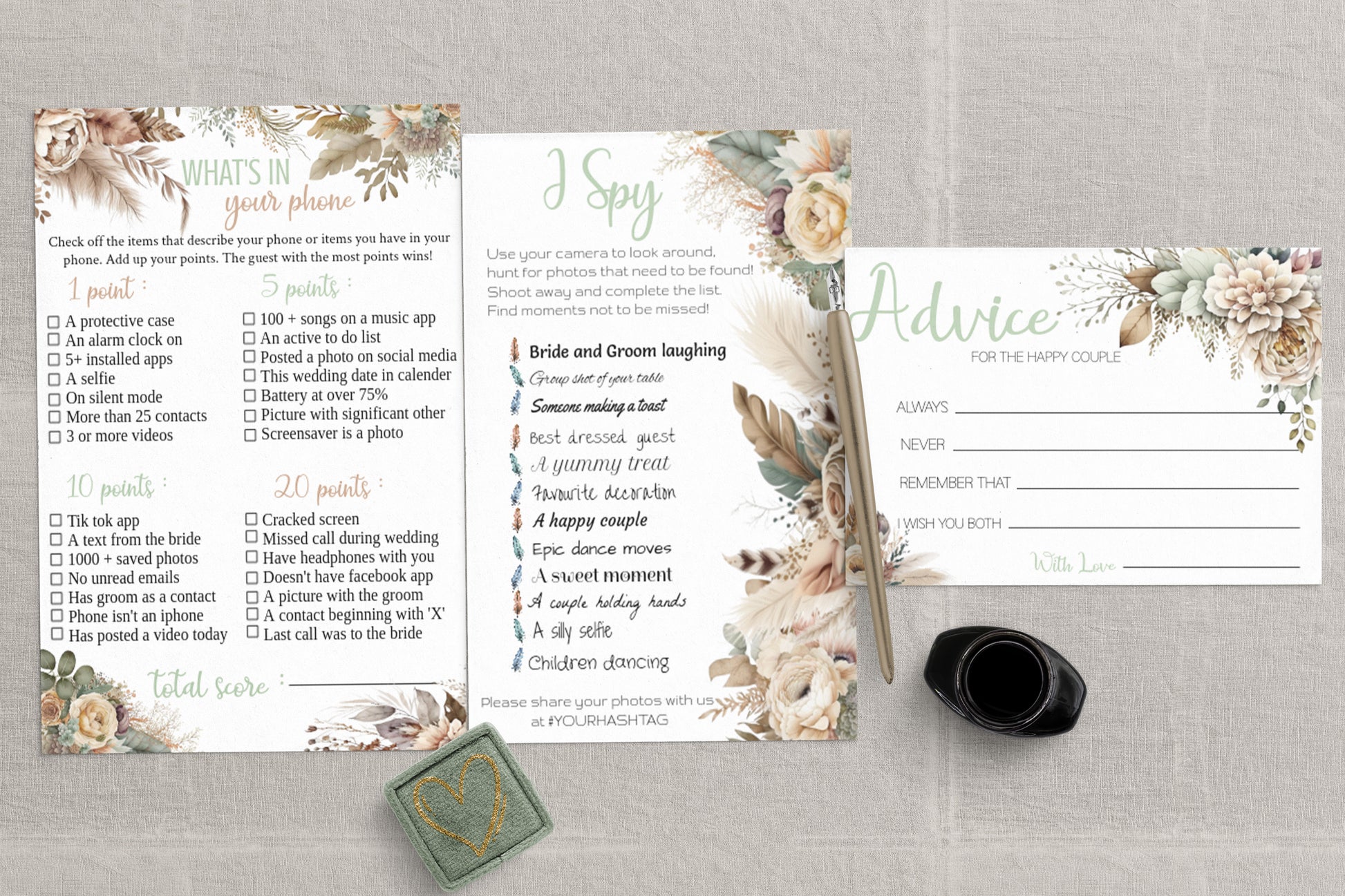 Natural Boho Blooms rustic game pack. Planning the perfect wedding experience? Our beautiful Wedding Game Pack Template Bundle, featuring natural florals, is designed to entertain your guests and make your day unforgettable. This editable template pack includes 9 unique wedding games, perfect for personalising to match your wedding style. Simply download, customise, and print to create a seamless, sophisticated experience that’s fun for everyone! Designed with soft cream florals, sage green accents, and golden brown feathers, this romantic bundle captures a nature-inspired aesthetic perfect for countryside, woodland, or boho-style weddings. A perfect choice for brides and engaged couples seeking an affordable yet elegant entertainment solution for their special day.