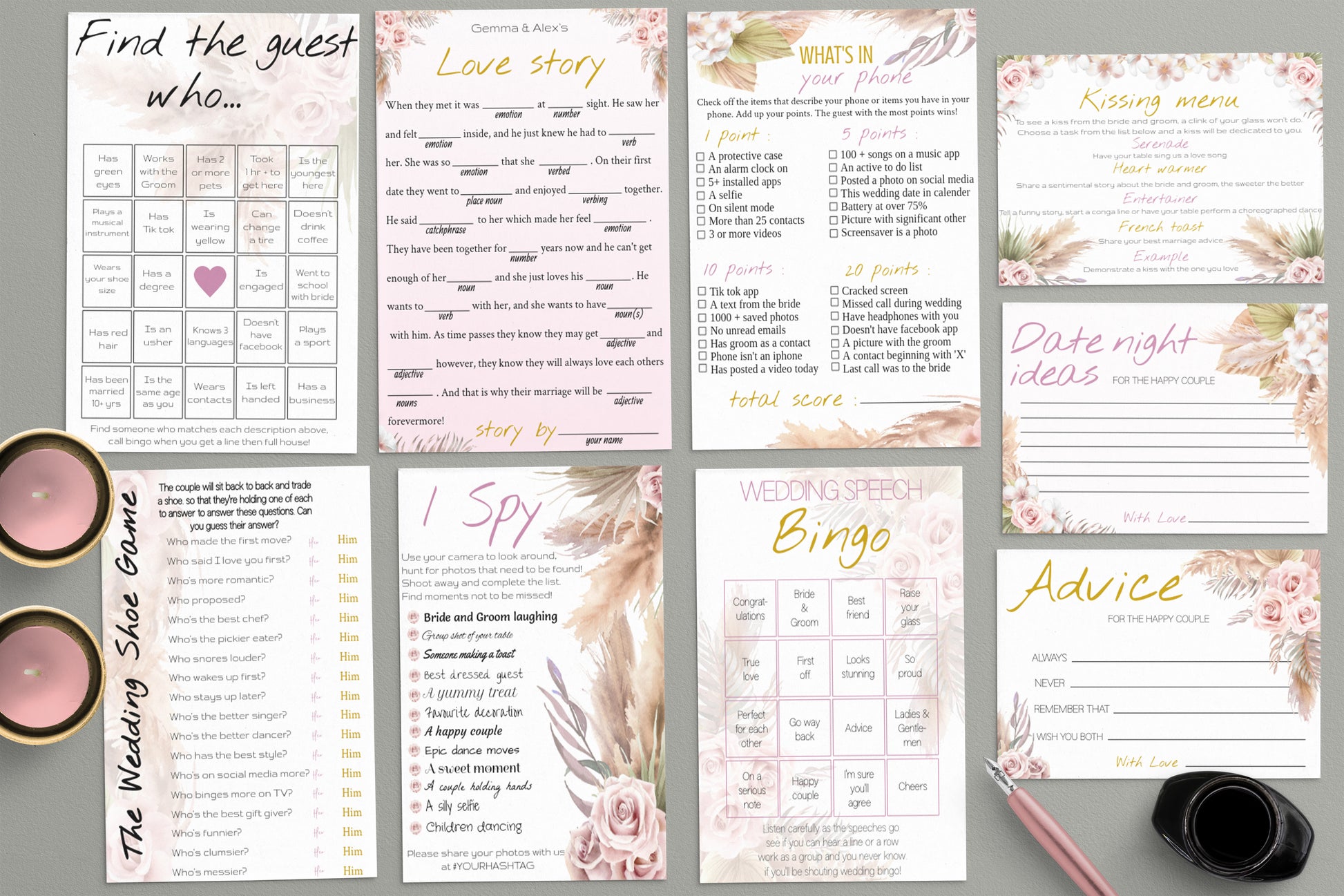 Delicate Pink Bohemian Wedding game bundle, planning the perfect wedding experience? Our beautiful Wedding Game Pack Template Bundle is designed to entertain your guests and make your day unforgettable. Featuring soft pink and white roses, delicate feathers, and earthy tones of gold and brown, this boho-inspired suite blends romantic florals with rustic charm—perfect for modern brides who want both beauty and value. This editable template pack includes 9 unique wedding games, perfect for personalising to match your wedding style. Simply download, customise, and print to create a seamless, sophisticated experience that’s fun for everyone!
