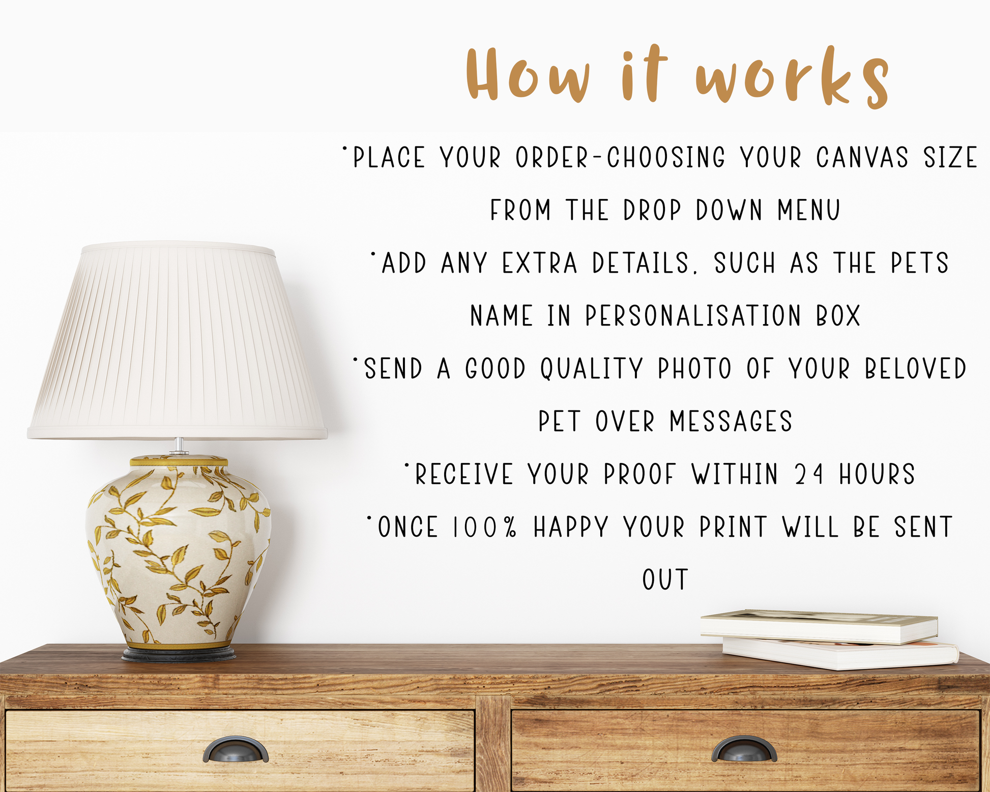 Celebrate your beloved furry friend with a custom hand-drawn line art portrait on canvas! Our personalised pet portraits are meticulously sketched by hand and then coloured in vibrant colours in a fun cartoon style that captures the unique essence and personality of your pet. Simply provide us with a high-quality photo of your companion, and we'll transform it into a one-of-a-kind masterpiece that is perfect for gifting, or as a special keepsake.