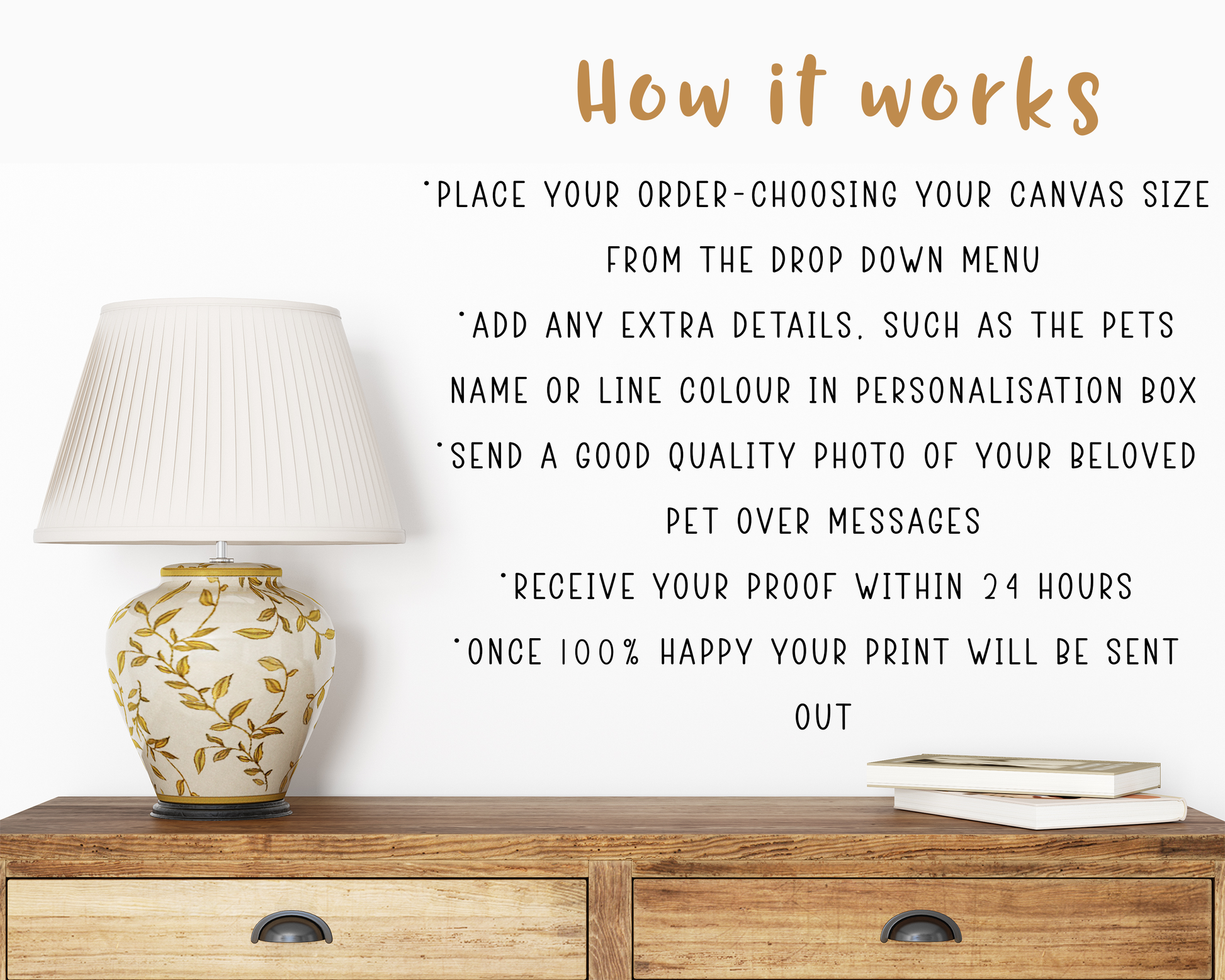 Celebrate your beloved pet in a unique and artistic way with our Custom Pet Portrait Canvas! Each portrait is a personalized hand-drawn line art piece that captures the essence and personality of your furry friend. Simply provide us with a high-quality photo of your pet, and our talented artists will transform it into a beautiful work of art, tailored just for you.