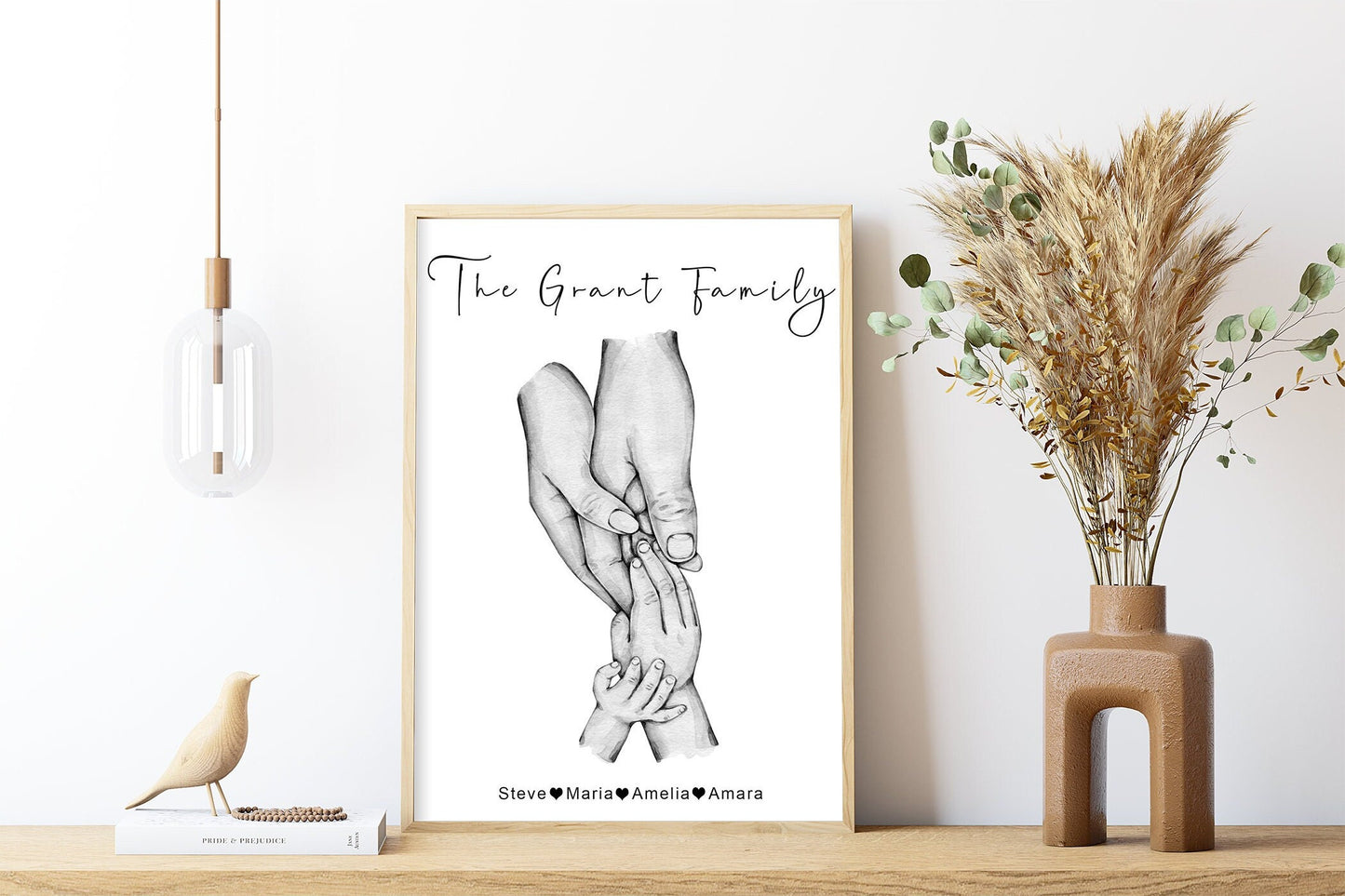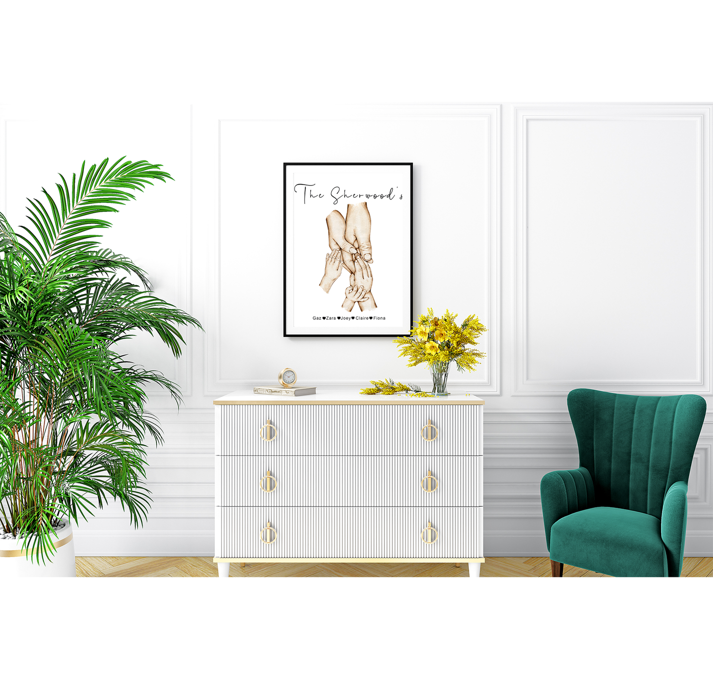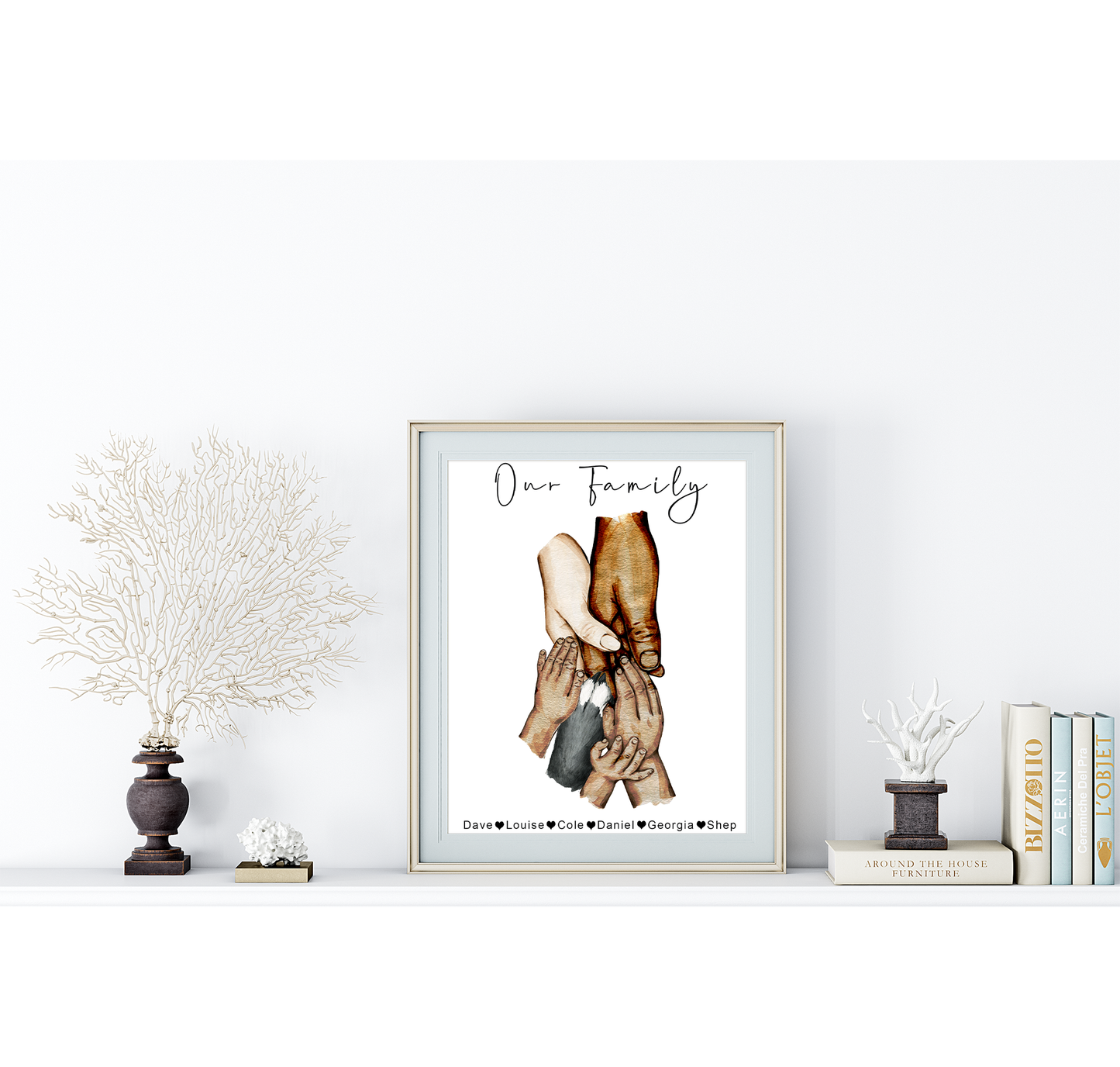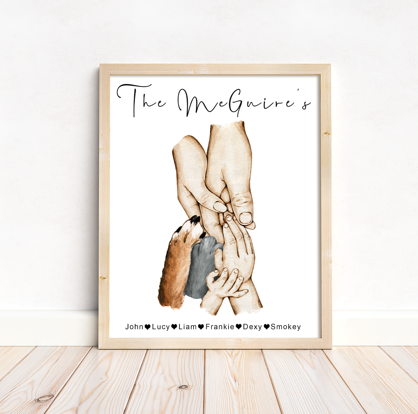 Personalised family hands portrait, featuring parents and up to 5 children as well as cat and dog paws. In either a beautiful watercolour style with natural skin tones or a classic monochrome in stylish black and white. Creating a touching portrayal of your family or make the perfect gift for any new parent, to welcome a new baby or as a touching memento for birthdays, Father's day, Mother’s Day, or any other special occasion.