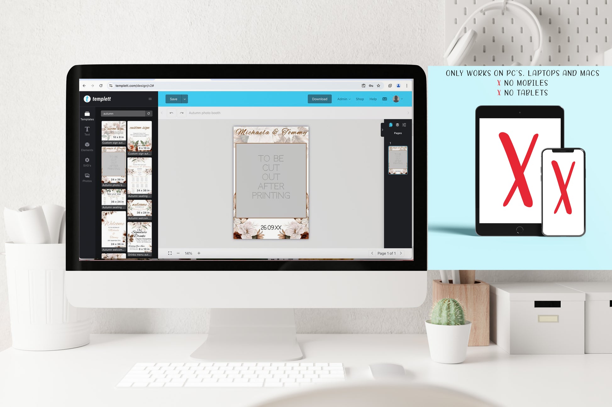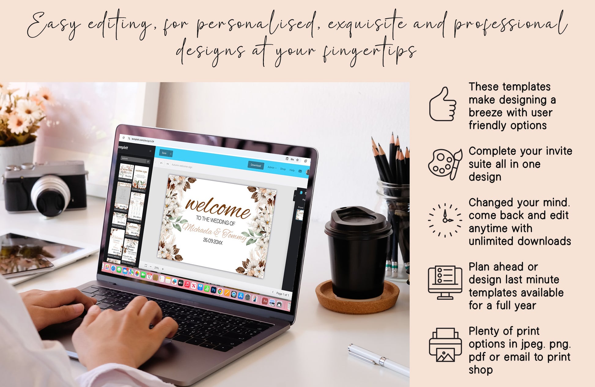 Templett is user-friendly popular editing software. No graphic design skills are required. Simply personalise the text, fonts, and colours to match your wedding theme and style. You can add your own photos front and back.