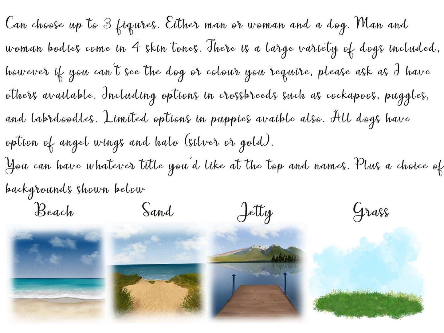 Please include the options per person for example (Man Steve - skin tone 1, hair - S21, jeans - 1, T-shirt - 2. Dog Bennie - boxer 3, wings and silver halo. Background beach. Message - I’ll never forget you