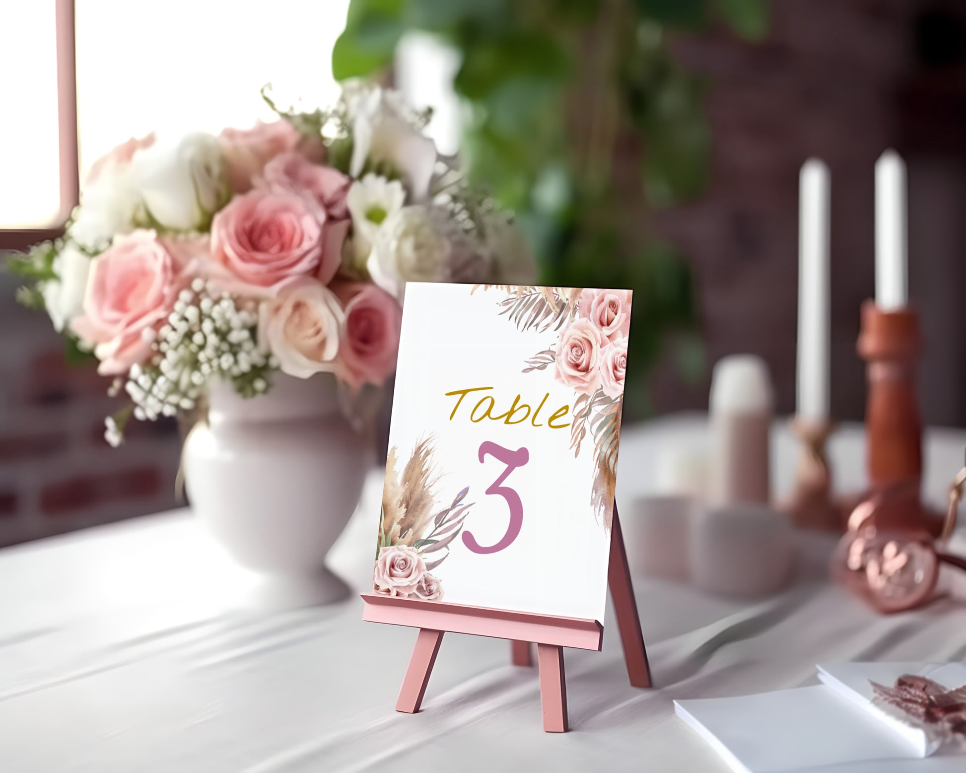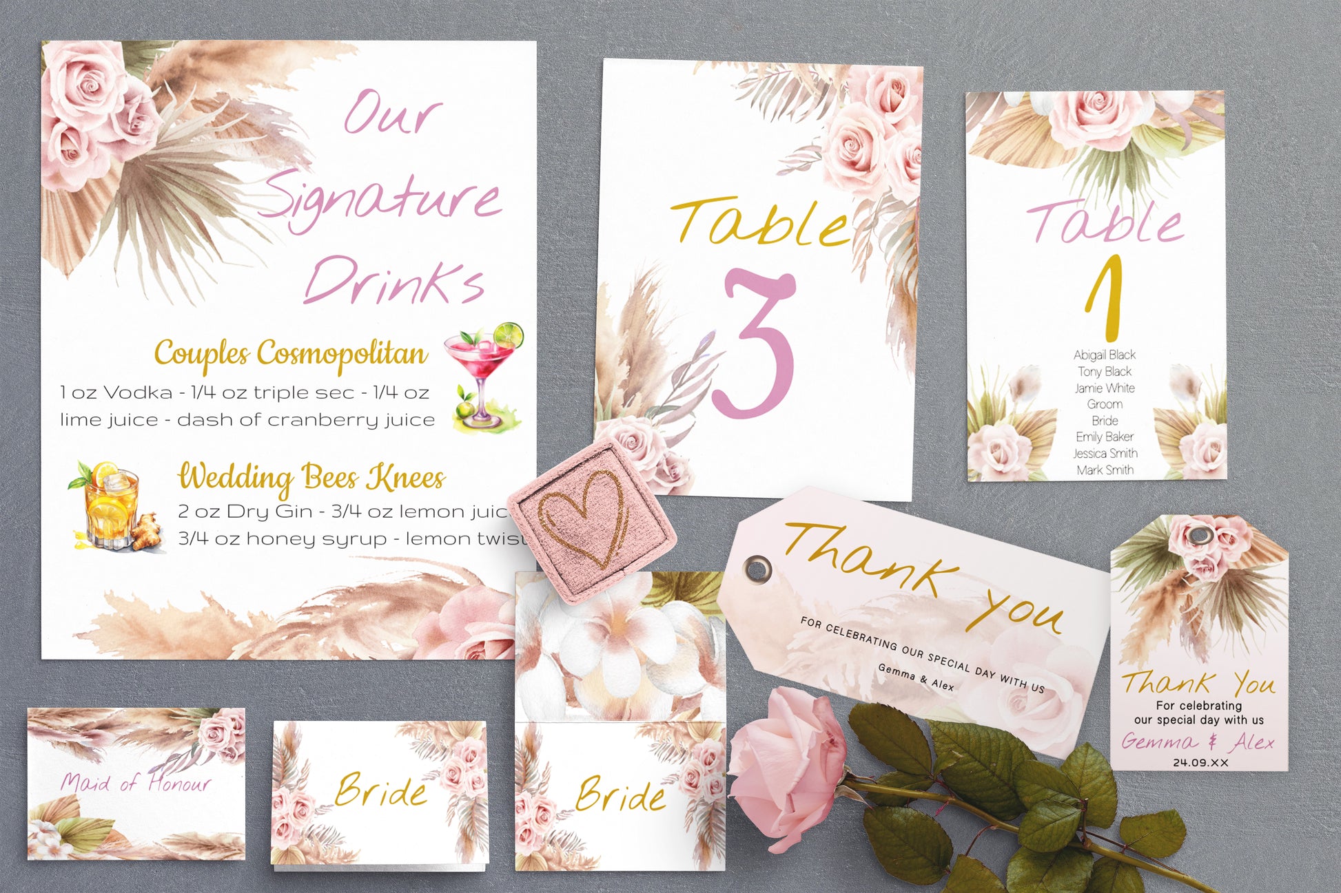 Delicate Pink Bohemian Wedding small sign bundle, the ideal choice for brides and engaged couples seeking an affordable yet romantic signage suite. Bring natural elegance to your wedding day with this fully editable, budget-friendly wedding sign bundle including place card, escort card, table numbers, favor tags and drinks menu. Featuring soft pink and white roses, delicate feathers, and earthy tones of gold and brown, this boho-inspired suite blends romantic florals with rustic charm—perfect for modern brides who want both beauty and value.