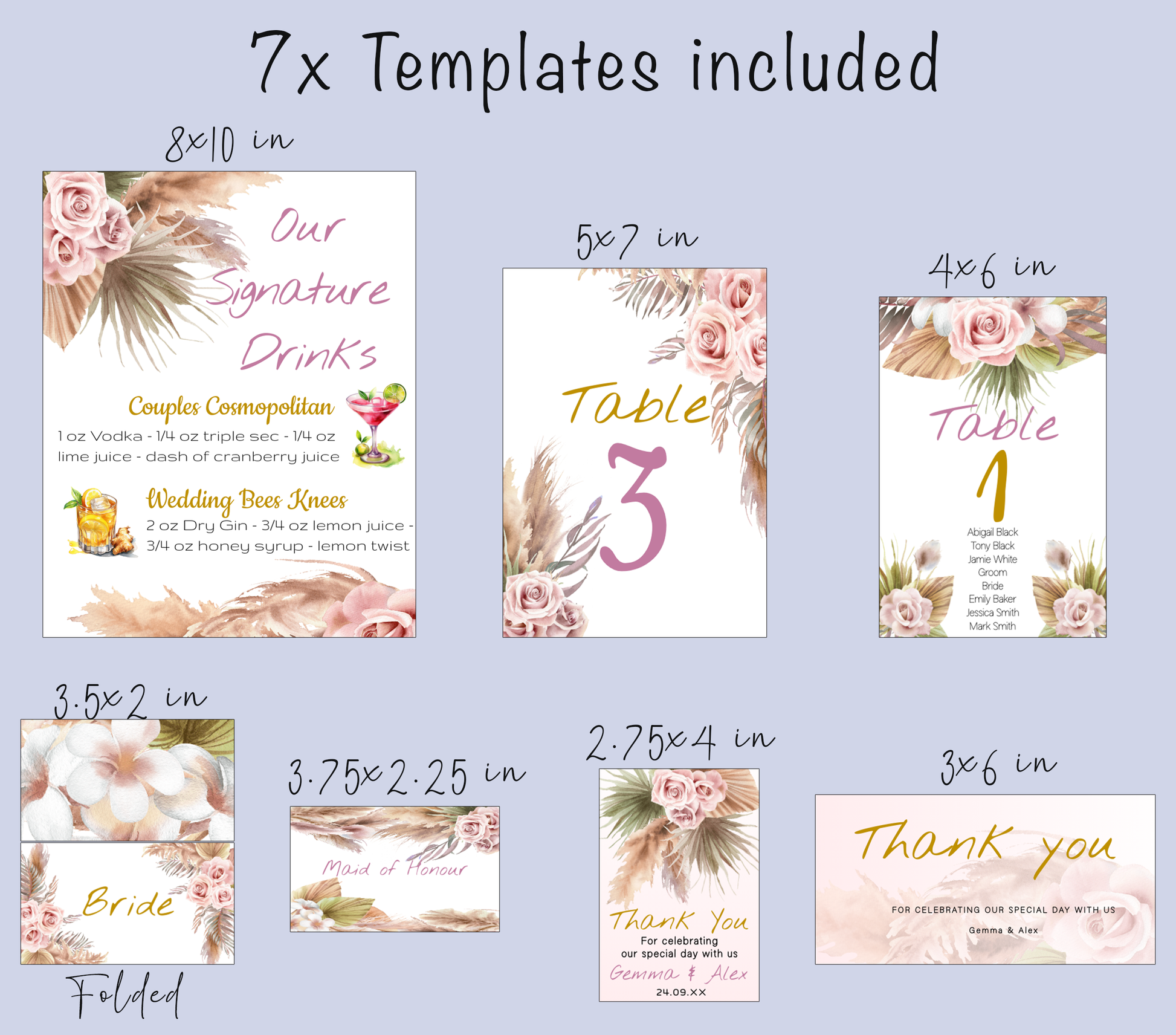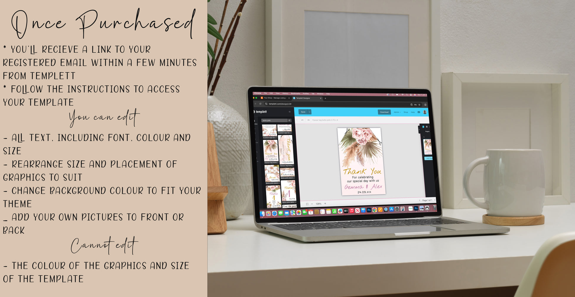 Templett is user-friendly popular editing software. No graphic design skills are required. Simply personalise the text, fonts, and colours to match your wedding theme and style. You can add your own photos front and back.