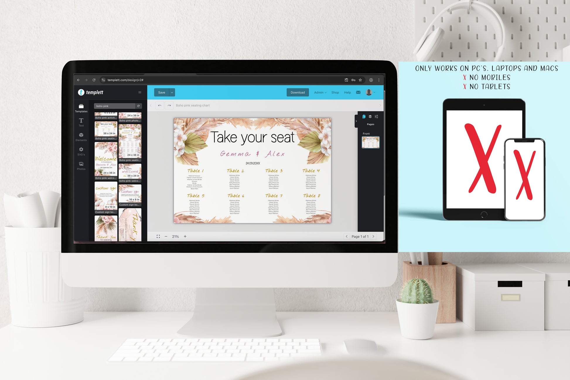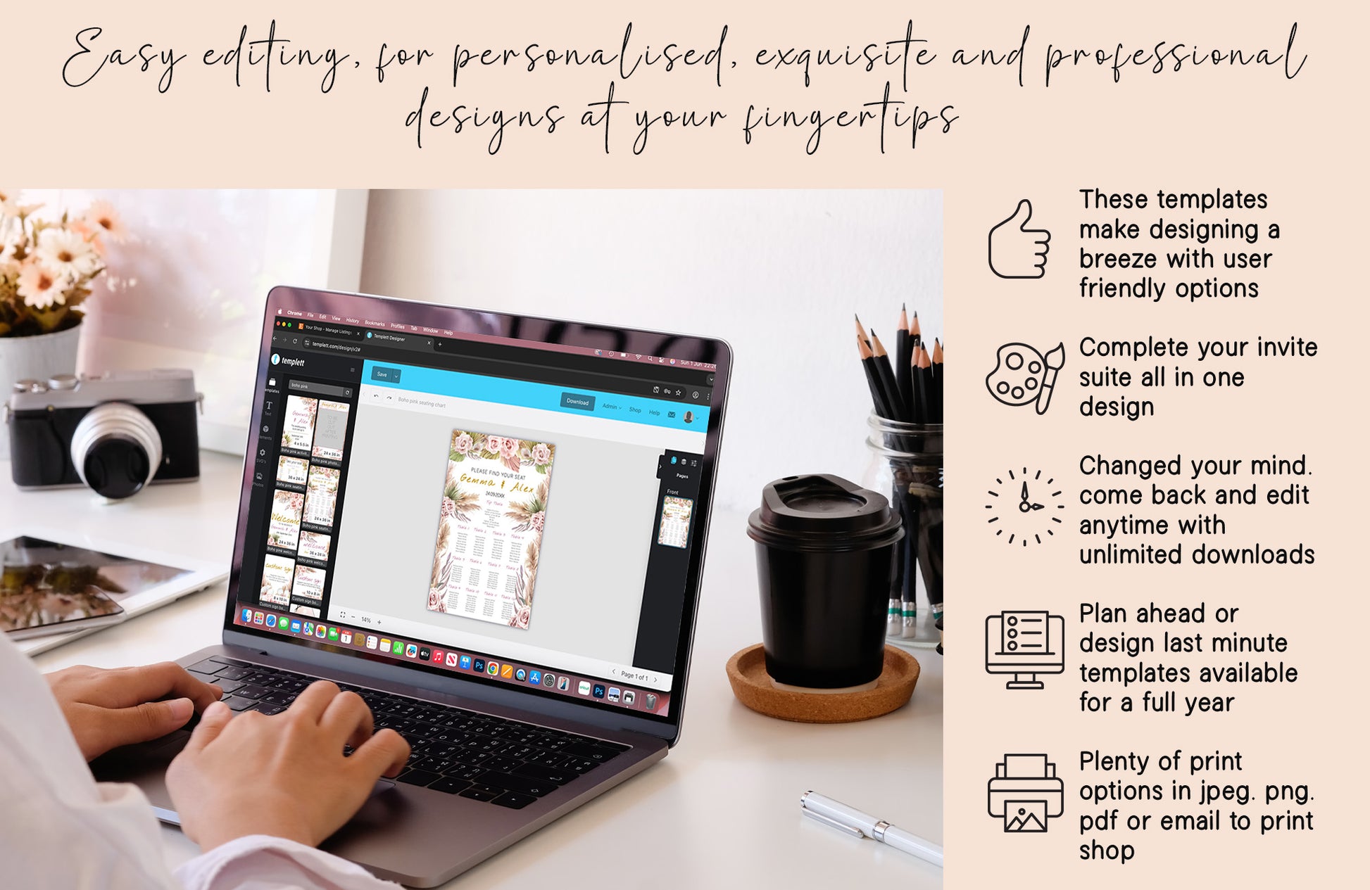 Templett is user-friendly popular editing software. No graphic design skills are required. Simply personalise the text, fonts, and colours to match your wedding theme and style. You can add your own photos front and back.