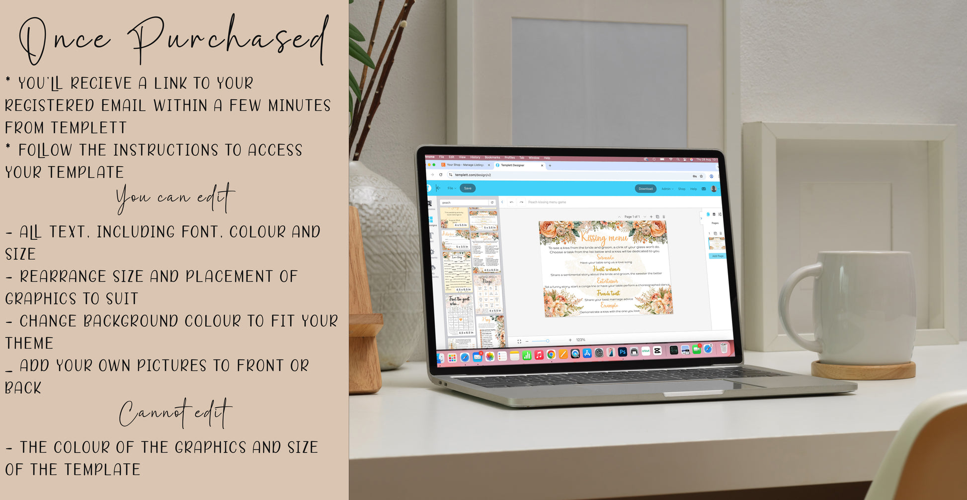 Templett is user-friendly popular editing software. No graphic design skills are required. Simply personalise the text, fonts, and colours to match your wedding theme and style. You can add your own photos front and back.