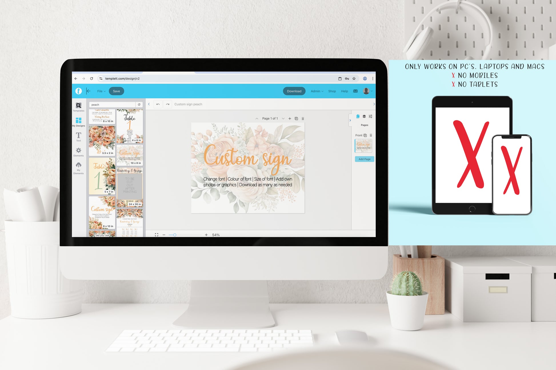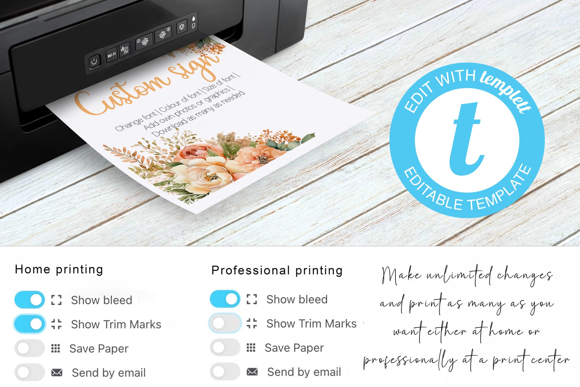 Templett is user-friendly popular editing software. No graphic design skills are required. Simply personalise the text, fonts, and colours to match your wedding theme and style. You can add your own photos front and back.