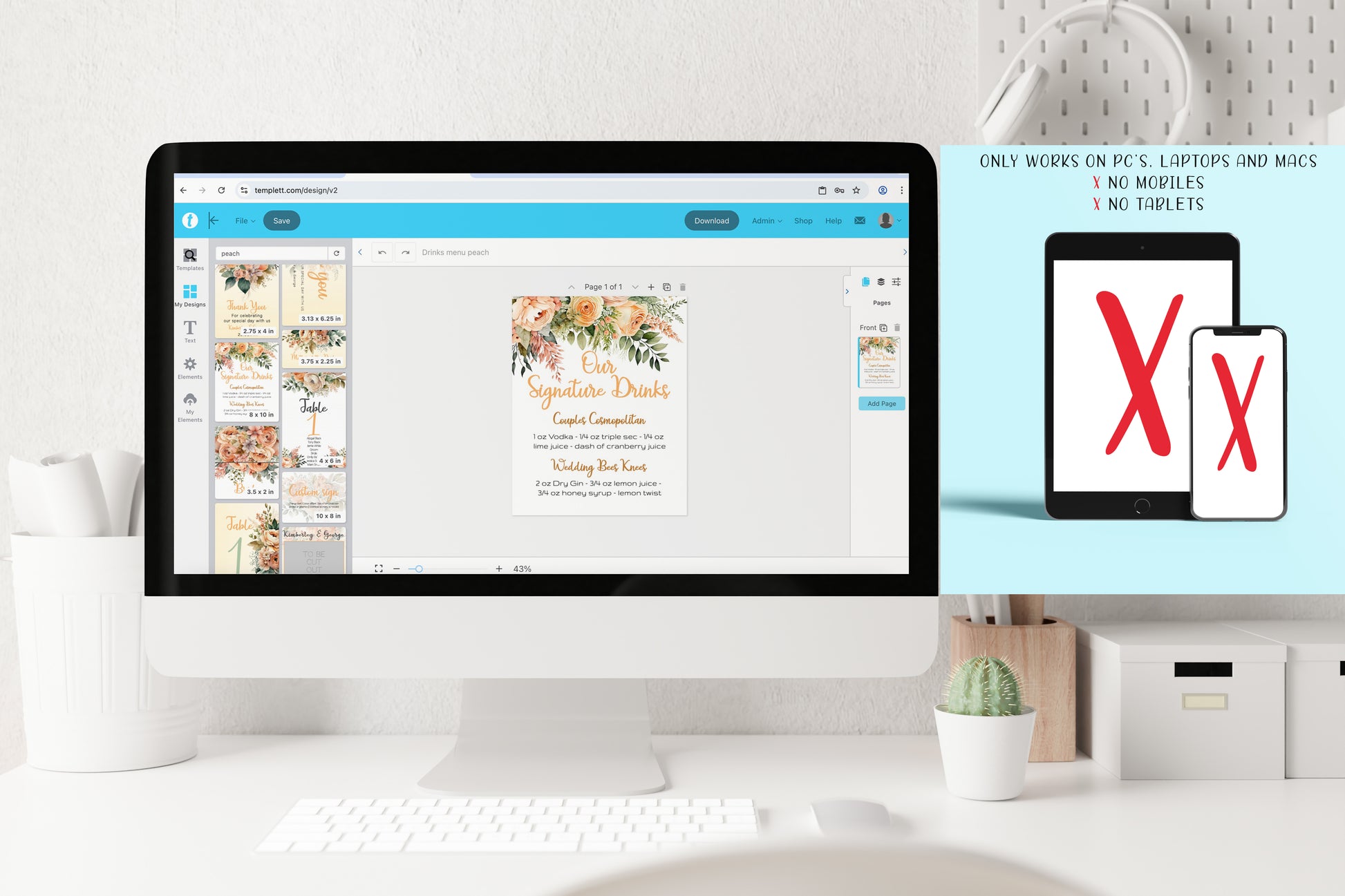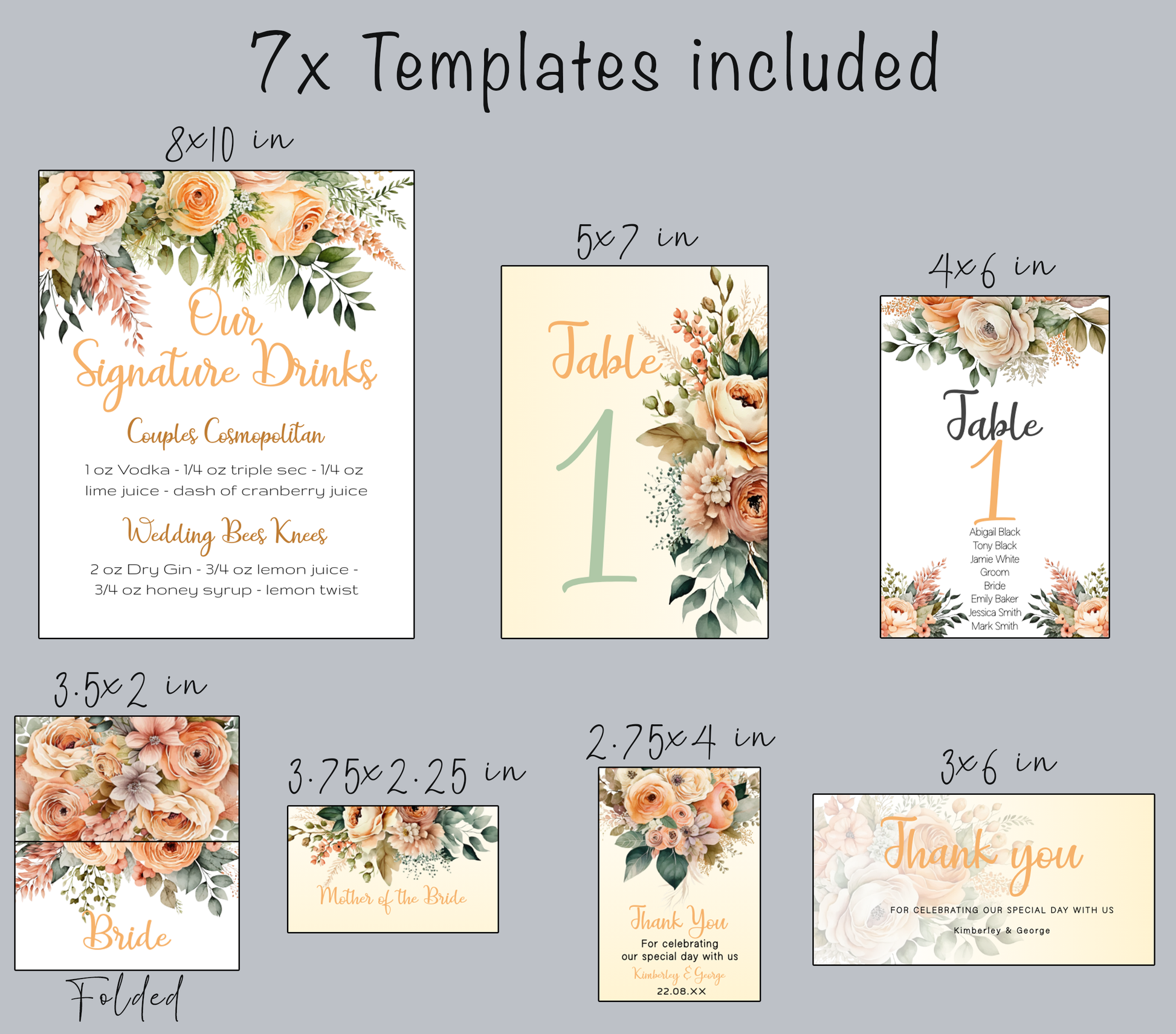 Welcome to our exquisite Peach Flowers Wedding signage templates, the perfect solution for brides and engaged couples seeking both elegance and affordability for their big day. Our editable templates allows you to create personalised wedding drinks menu, table numbers, place cards and favour tags all adorned with a charming peach flowers design.